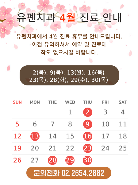 인쇄 스크랩 목록 공지사항 | 2026년 4월 진료일정 안내입니다 페이지 정보 유펜치과 52 0 2026-03-16 02:35:47 본문 유펜치과 2026년 4월 휴진 일정 안내입니다.약속시간 착오 없으시길 바랍니다감사합니다 인쇄 스크랩 목록 다음글 ▼2026년 3월 진료일정 안내입니다 댓글목록 등록된 댓글이 없습니다. 다음글 목록
